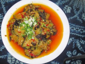 An eggplant dish in a restaurant in Dali, Yunnan. I returned and ordered the same dish the following night. Despite them having a menu with words, pictures and listed prices I was charged less on the second occasion. Perhaps it was a frequent diners discount. One of the young men I met at Lake Lugo, and with whom I dined one night, said our meal was discounted because we ate at a restaurant where he had eaten previously. I never ate eggplant before going to China but I had quite a bit of it in Yunnan and enjoyed it. Sichuan is the province known for its spicy food but in Yunnan chilis were sold in large quantities from large bags and appeared in copious amounts in prepared food.