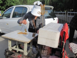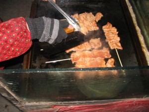 These are my favourite kebabs cooking on a hotplate on a bicycle. After cooking they were brushed with a bean paste and dusted with several different spices. Sometimes people buy them stuffed inside a flat bun which is also warmed on the hotplate. Other kinds of kebabs including meat, tofu and squid are also available. The Muslim style kebabs are cooked over hot coals and are available at other stalls and restaurants. They are dusted with spices and very yummy too.