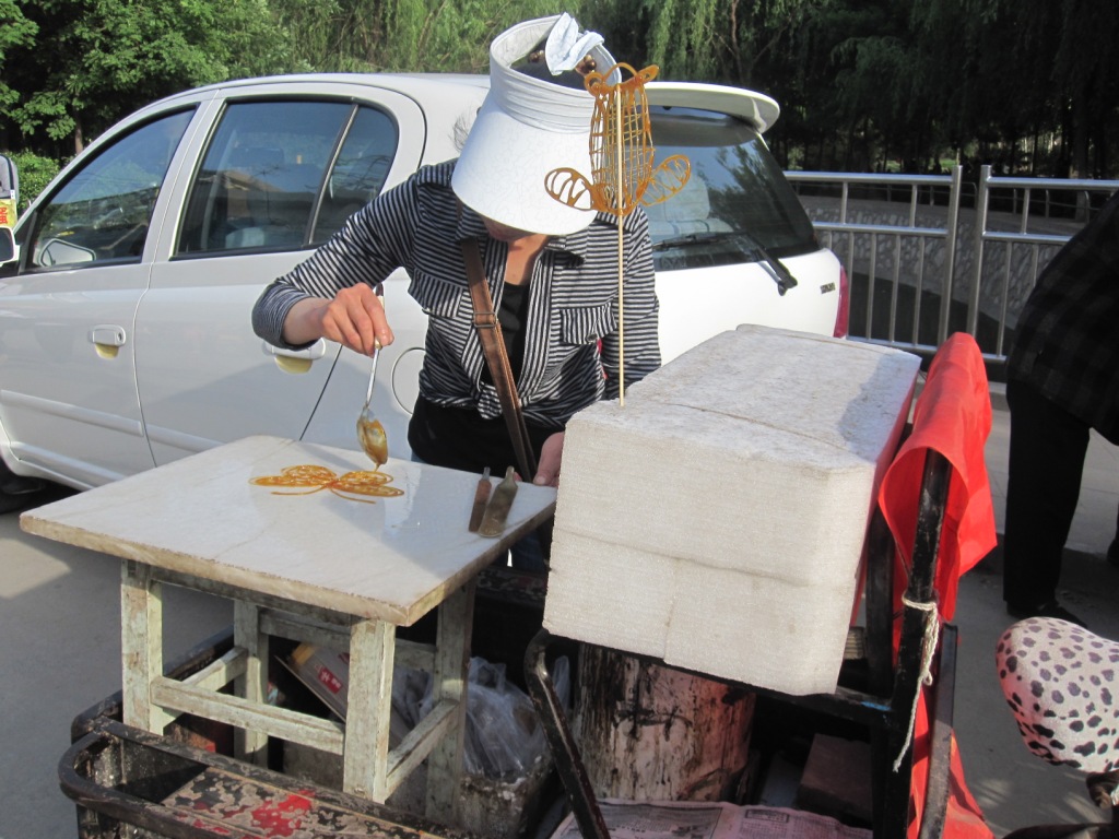 Drawing in sugar. It was melted over a small heat and the molten liquid drawn into various shapes designed to appeal to potential customers. A completed one is hanging near the makers head. This stall was set up near a kindergarten at close of day. It is a common folk art seen in many tourist areas.