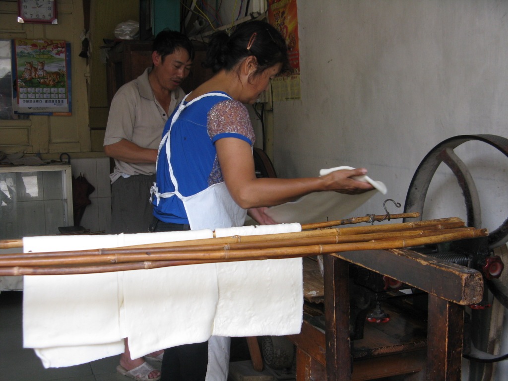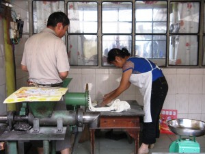 These people were working in a small village near Dali in Yunnan. They put the dough through the extruder and then folded it up again.