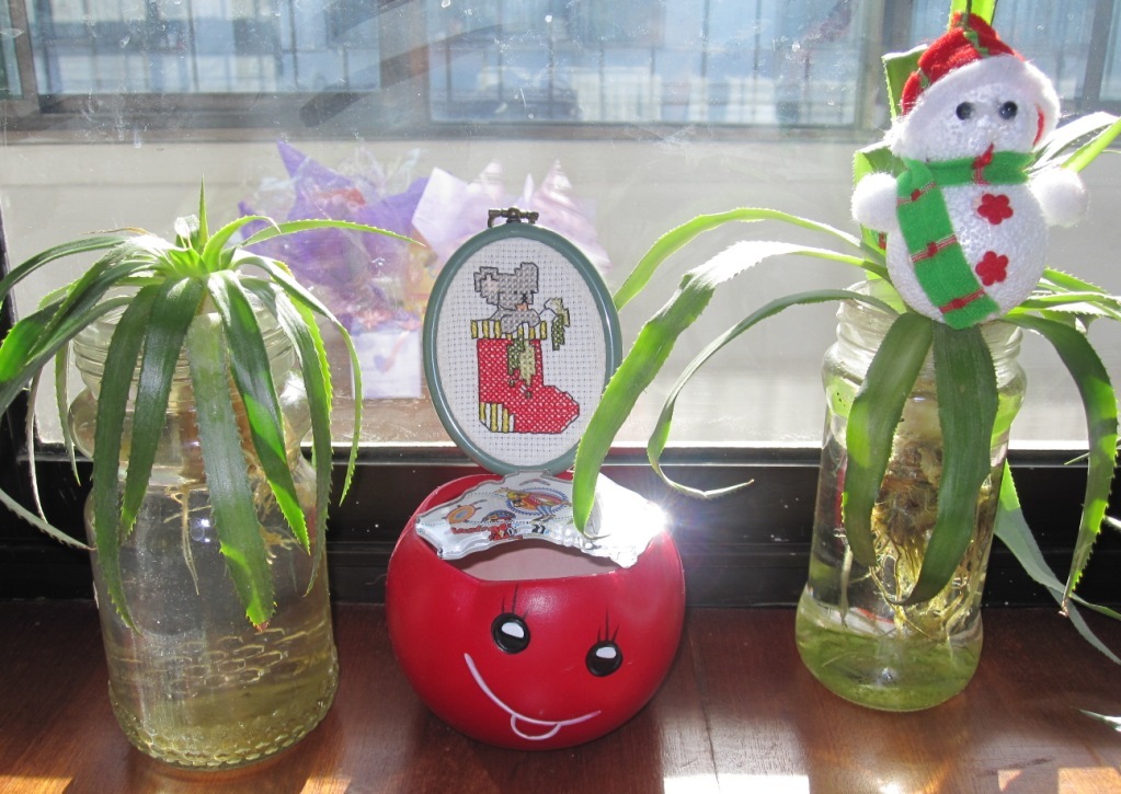 My pineapple top “Christmas tree” with the snowman tree ornament from Christmas lunch. I brought the cross stitched koala in a stocking from Australia. It now has a new home in the Philippines. The small red pot previously had cacti in it and was a gift from a student last Christmas. Obviously it didn’t survive the year.