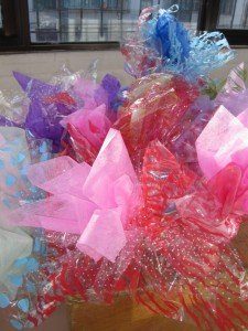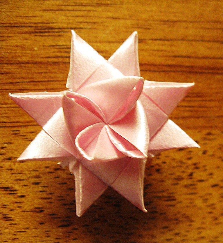 One of her special ribbon designs. Earlier in the semester the college held a dormitory competition and some of the students folded ribbons into similar and other designs to stick on their walls.