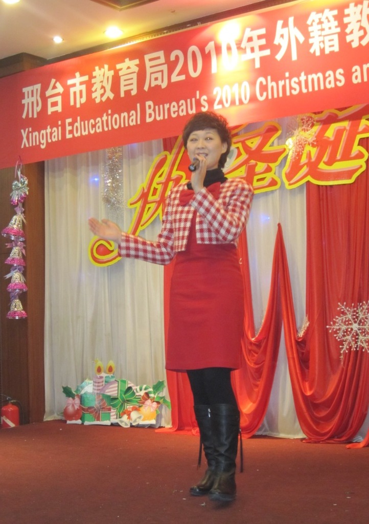 One of the teacher entertainers at the city’s Christmas dinner for foreign teachers. A number of the Chinese teacher entertainers had dressed in Christmas colours.