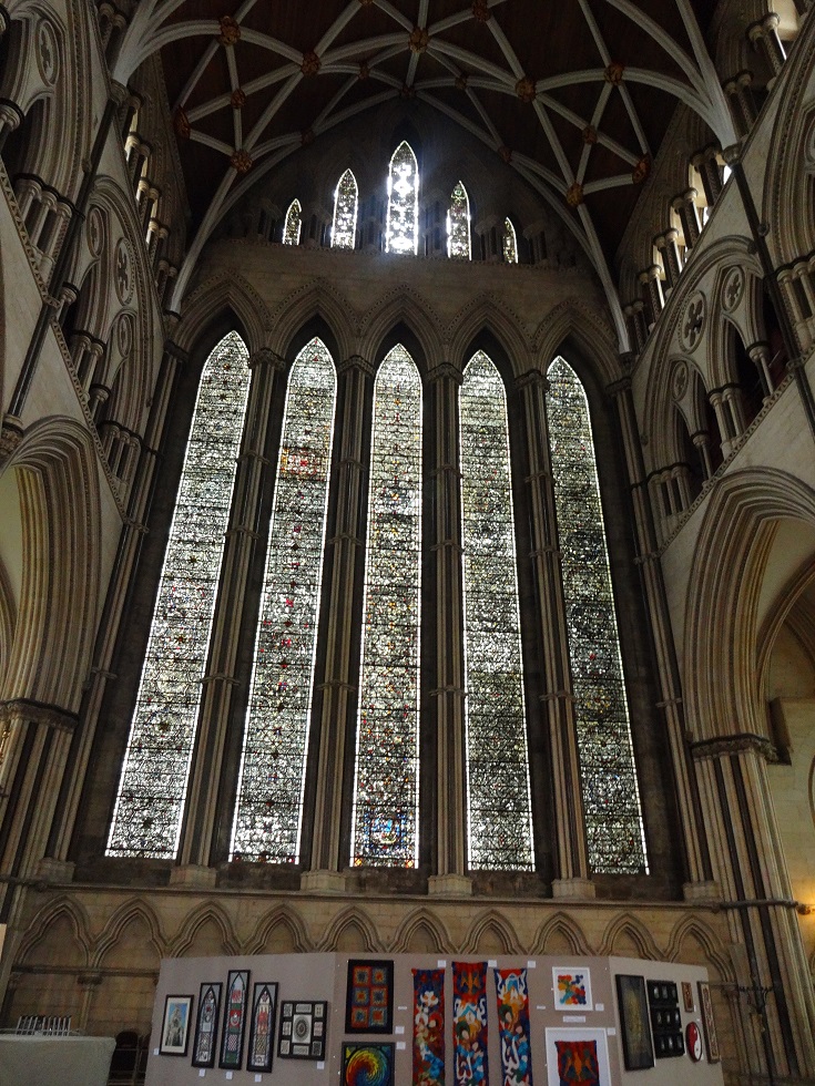 Medieval stained glass windows and an embroidery display based on motifs in the church