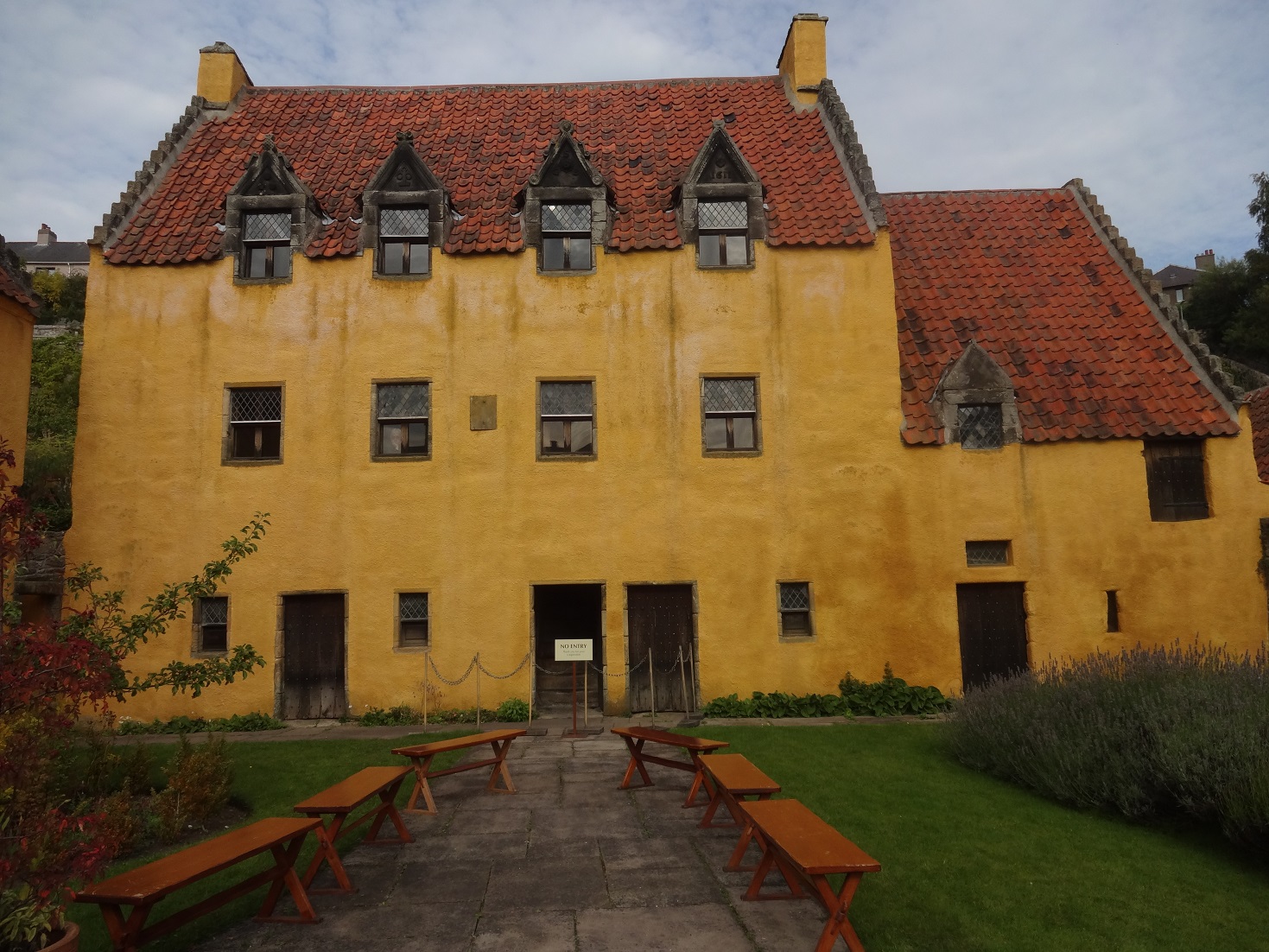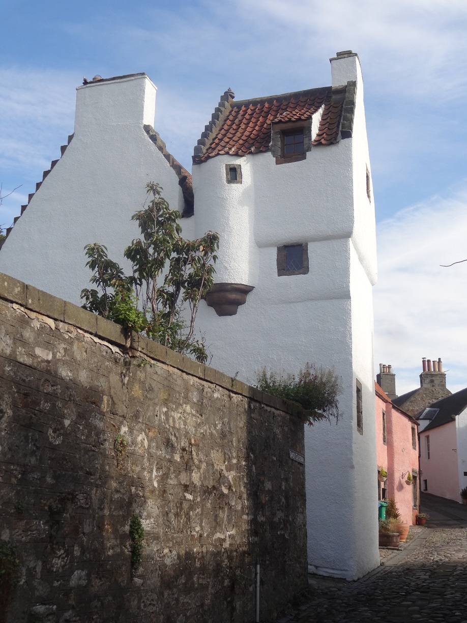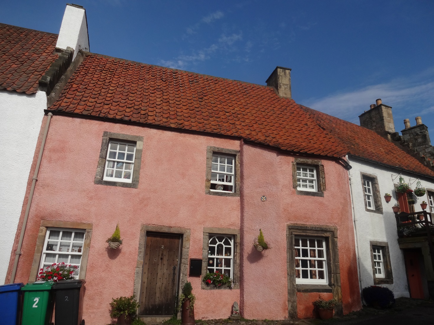 Culross is a small village on the Firth of Forth west of Inverkeithing and reached via 2 buses. Its history is associated with a monastery from the 6th century, monks who mined coal and rescued a royal damsel in distress, a couple of saints, export of coal and salt, creation of iron griddles, import of red pantiles as ballast, a smart man called George Bruce C 1548-1625 friend of the king and also the National Trust. The monks ran into trouble when the coal seam disappeared under water and later they allowed George Bruce to use techniques acquired during his travels to continue the work. He built a coffer dam and created a tall strong wall around a tidal island. A shaft was dug over which he installed an Egyptian wheel which drained the mine and allowed mining to continue for about 50 years until a fierce storm ruined it, the same year as Sir Georges death.