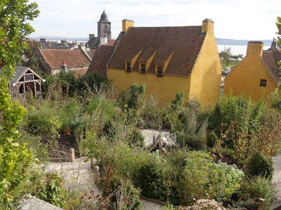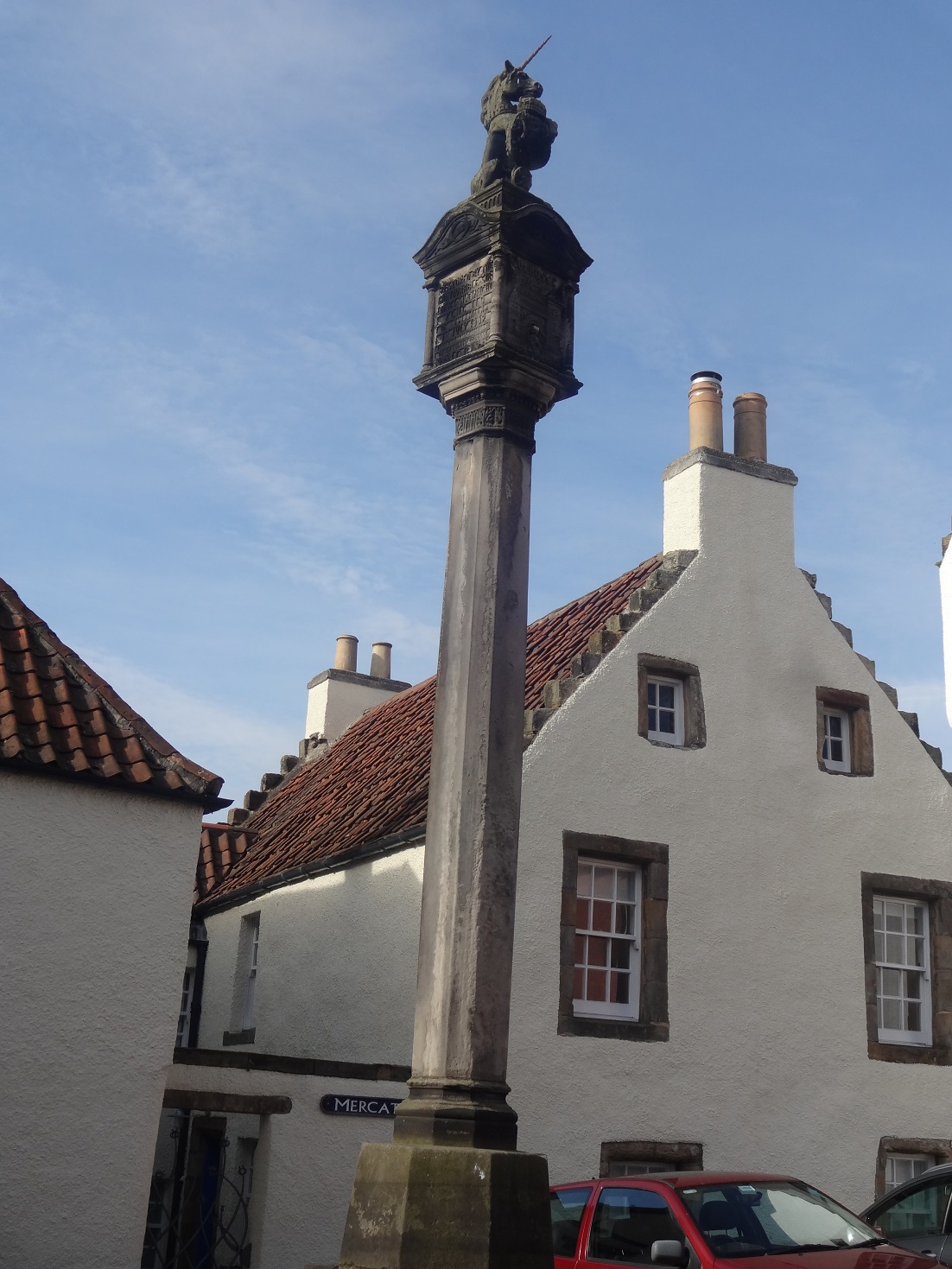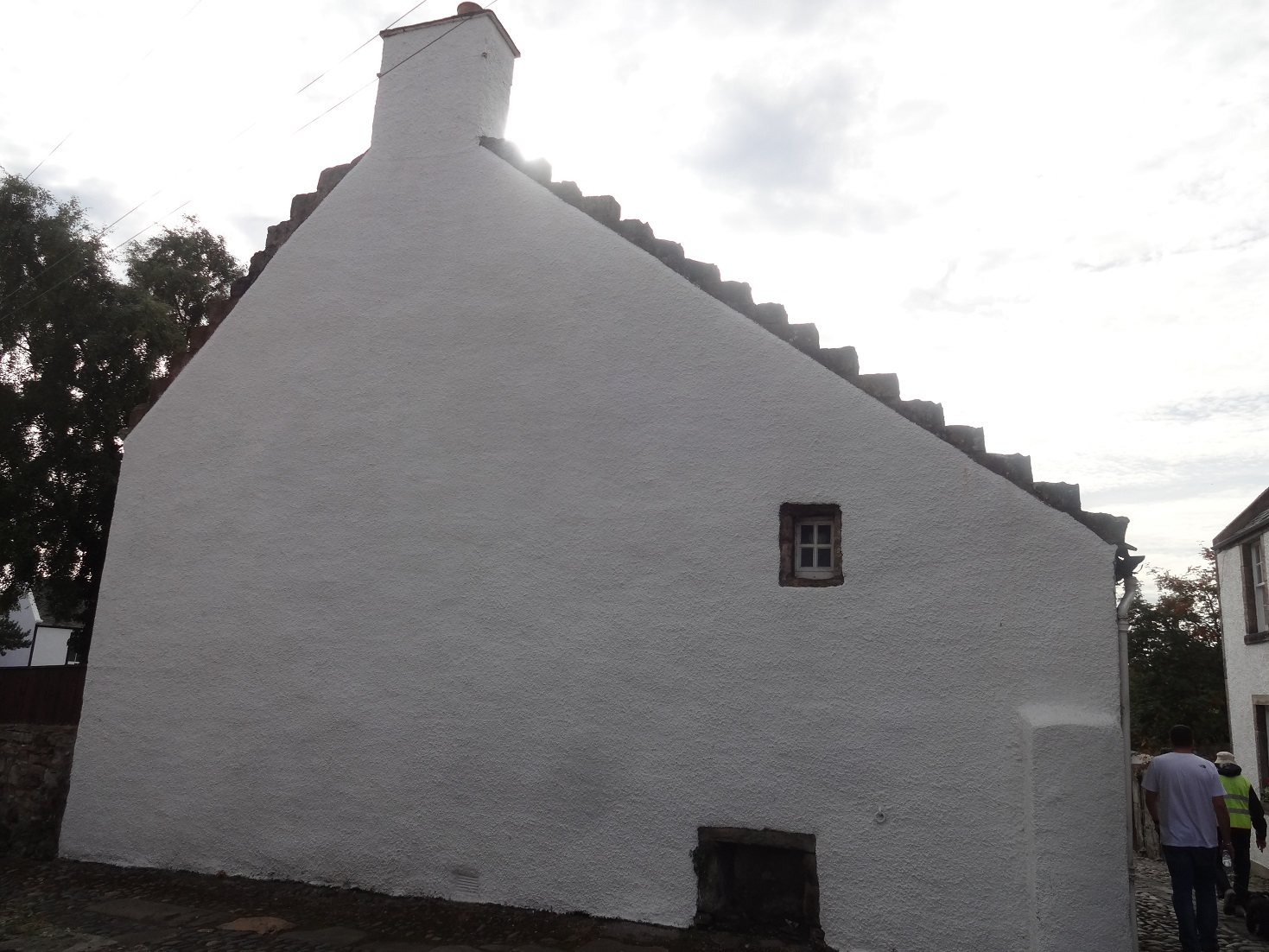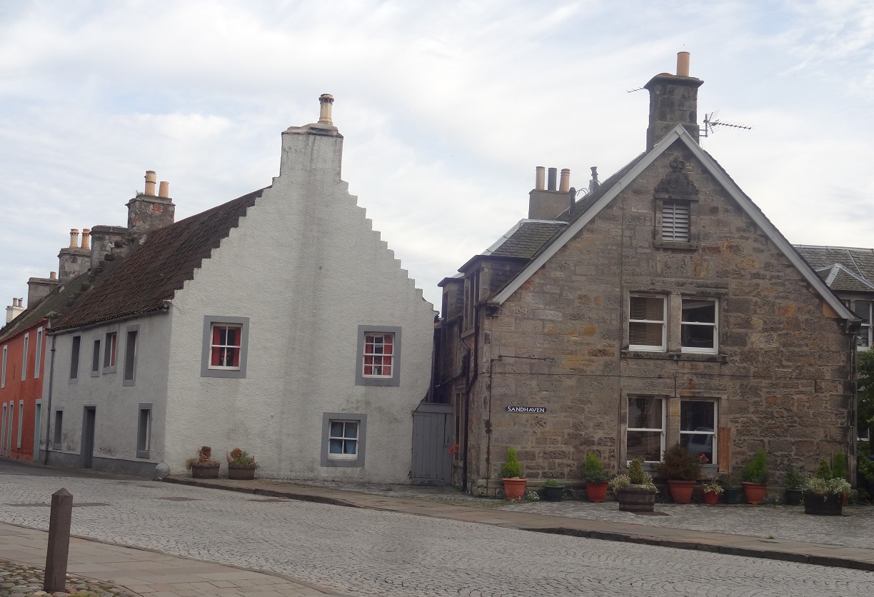 Culross is a small village on the Firth of Forth west of Inverkeithing and reached via 2 buses. Its history is associated with a monastery from the 6th century, monks who mined coal and rescued a royal damsel in distress, a couple of saints, export of coal and salt, creation of iron griddles, import of red pantiles as ballast, a smart man called George Bruce C 1548-1625 friend of the king and also the National Trust. The monks ran into trouble when the coal seam disappeared under water and later they allowed George Bruce to use techniques acquired during his travels to continue the work. He built a coffer dam and created a tall strong wall around a tidal island. A shaft was dug over which he installed an Egyptian wheel which drained the mine and allowed mining to continue for about 50 years until a fierce storm ruined it, the same year as Sir Georges death.