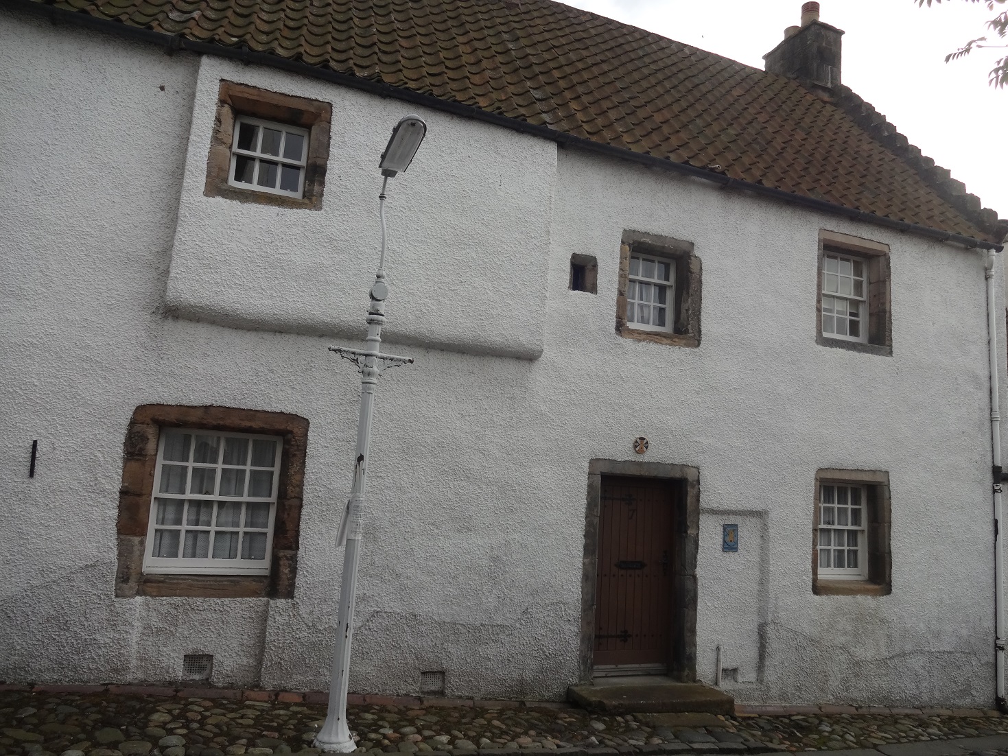 Culross – Town House, site of town official weighing beam – the tron, statue and information about another famous inhabitant and some quayside warehouses