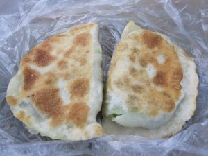 On Monday I bought some fruit, nuts and some sort of pumpkin bun at the market. Late this afternoon I returned to buy more fruit. I bought bananas as usual plus some lychees which are pretty delicious. I decided to buy some dumplings from a woman who I’d watched on Monday. After having a mouthful, it tasted like the green pancakes available in Xingtai. I returned for 2 more. They contain what seems like a mixture of scrambled egg, lots of garlic and something green like a spinach.