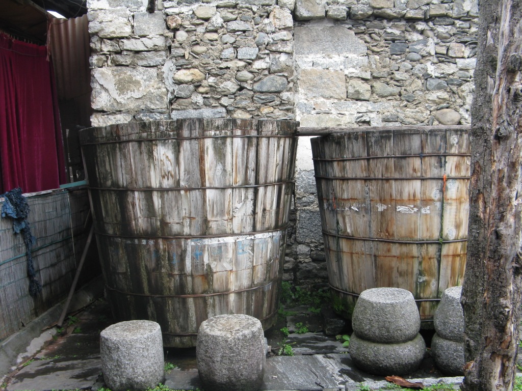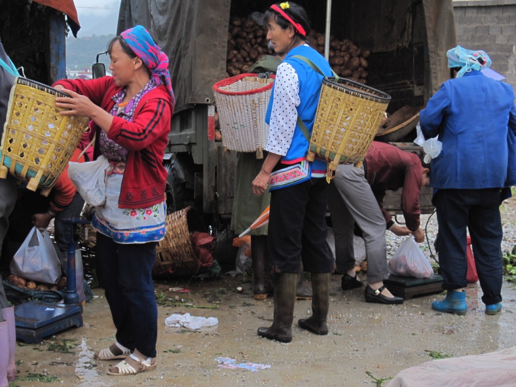 However, many others seem to wear ethnic clothing as a matter of course, especially in the local villages. Unfortunately, my visits to the villages have coincided with rain & it’s a bit hard to see much when people are obscured by umbrellas and sometimes raincoats. The women in this area, unlike Lijiang & Lugu Lake wear pants instead of skirts. Much more practical. Almost all at the market were wearing gumboots of various styles.