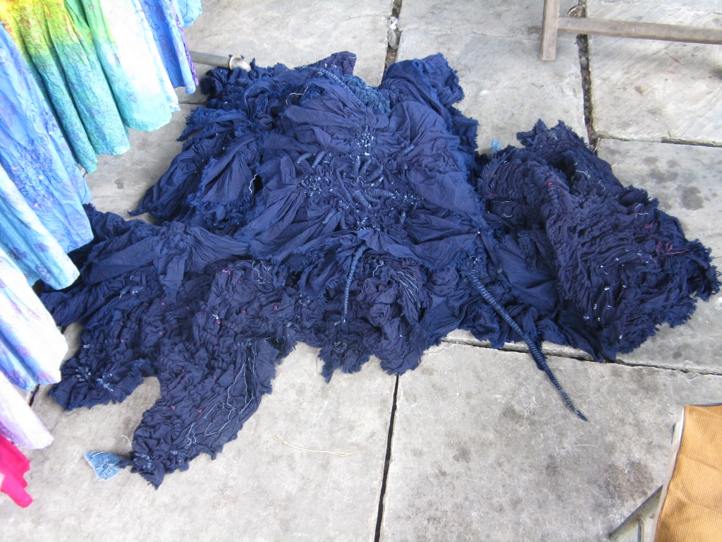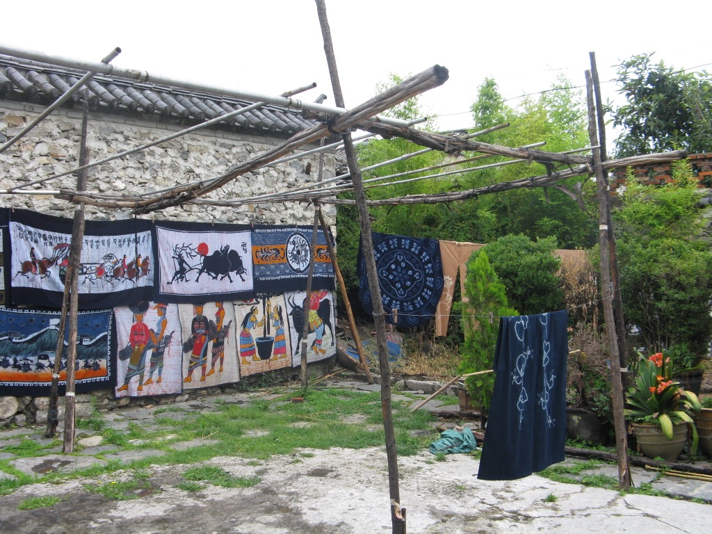 Batik made from indigo in the traditional blue and white as well as other colours is very common. I have seen the material being knotted and some dye vats but no dying yet.