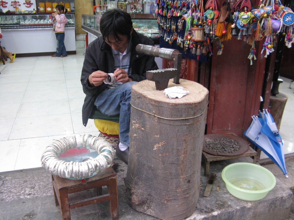 Like Lijiang, silver is a common with silversmiths hammering away at the front of shops in addition to numerous shops selling clothing and nick knacks made from fabric.