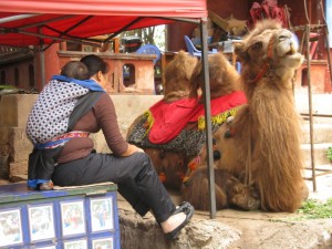 Minding baby while minding the camel available for tourists to sit on at a temple complex in Kunming.