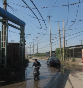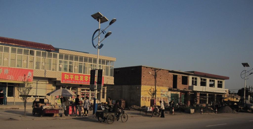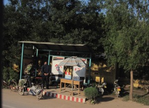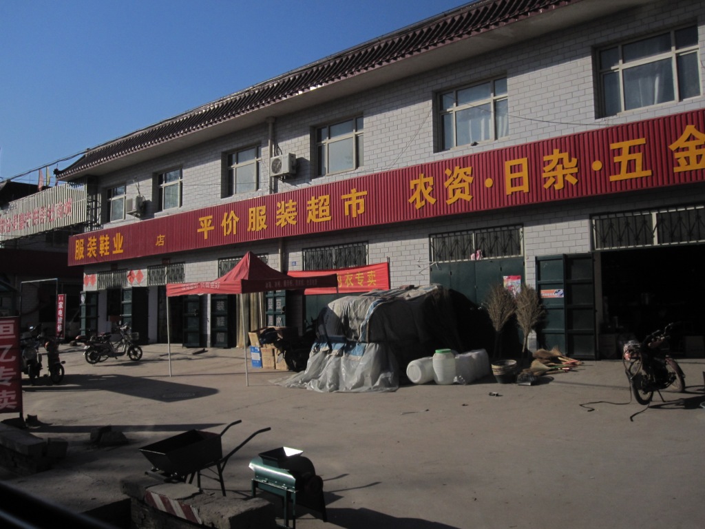 One of the many dusty village streets. Many of them had piles of products covered up outside or near shops. Most would have been bags of fertlizer but one shop did have multiple boxed home appliances such as refrigerators sitting outside the shop.