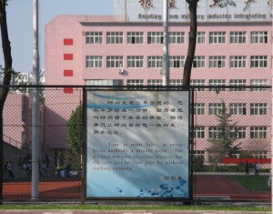 The sports field and a teaching building are behind the saying. You’ll probably need to enlarge the photo to read it.