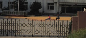 Two people inside a large compound of some sort. Corn and something else which I can’t see clearly is being dried. Corn was being dried by the roadside at other places on my bus trips.