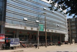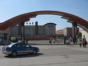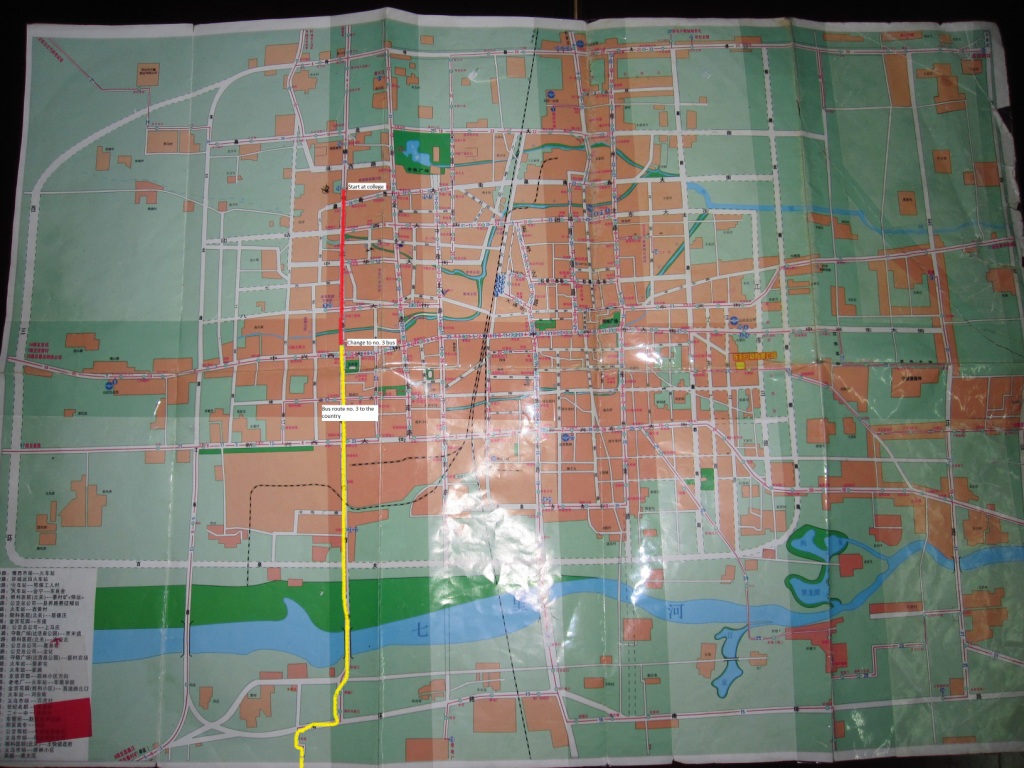 Map of Xingtai showing my route in red from the college to where I changed to the bus maked in yellow and where it runs off the map.
