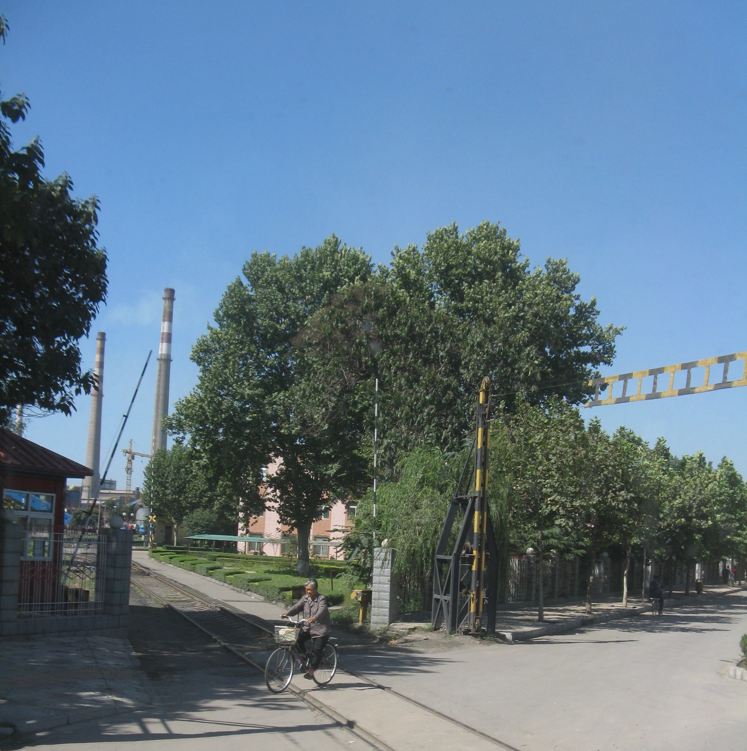 Train tracks across a main road and going into an industrial site.