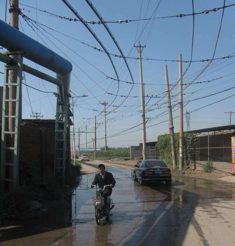 Trolley bus lines leaving the village and heading off . No doubt there is a mine to which workers are bussed.