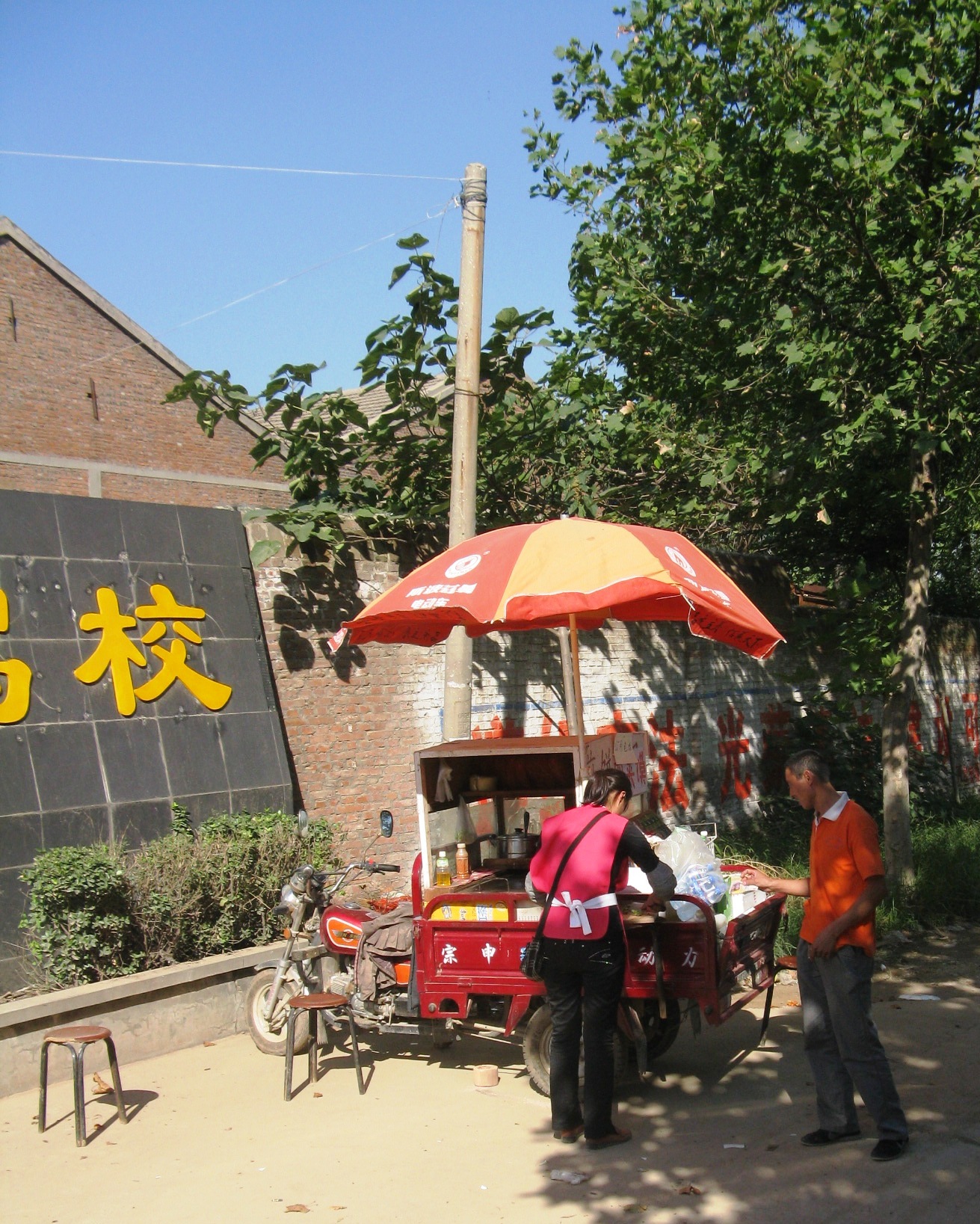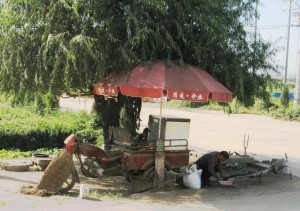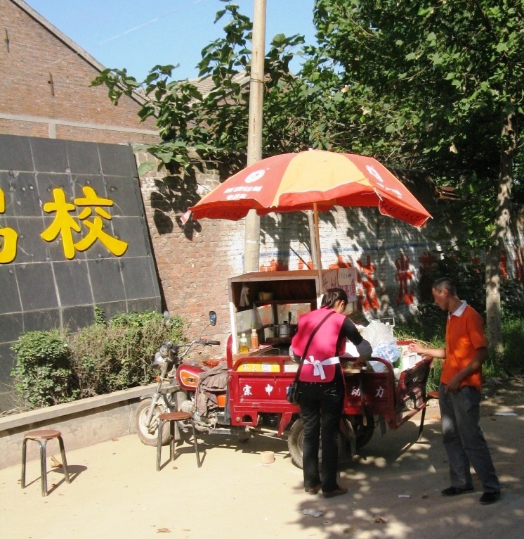 A roadside food vendor. The bike is electric but many are normal muscle powered tricycles with a much less elaborate structure. It was in the country outside a big gate to a housing or employment centre. She was finishing the making of a Chinese hamburger and the driver waited the extra minute required to allow the man to board.