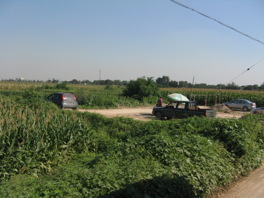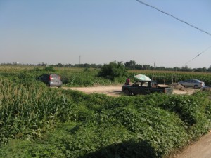 Route 25 was soon in the country driving along narrow roads roughened by the addition of hardened dirt from construction works . It was about a 50 minute round trip in mainly rural surroundings. The driver reached a certain point in a very rural village and turned around. Occasionally a gap in a field of corn would be bare to reveal a car or two and some marking out on the ground.