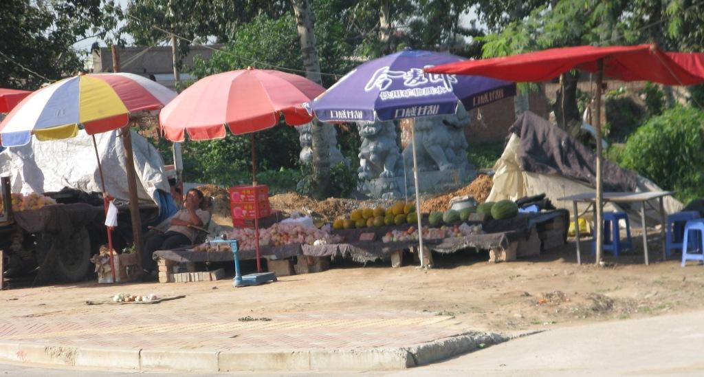 A fruit and vegie seller at a crossroads not far from the college. The lions behind are part of a stonemasons stock which is all I managed to take of the stonemason display. There are several stonemasons in a street behind where the bus did not travel.