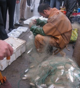 Man selling his own catch; tiny goldfish encased into key rings. I’ve seen them in tiny bottles but never in anything without a lid.