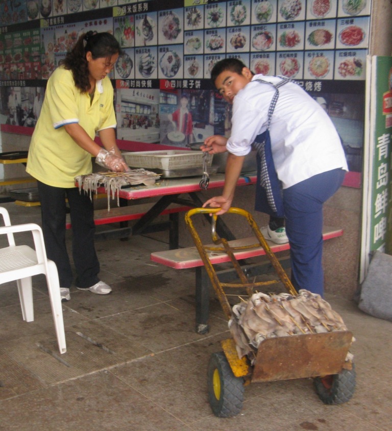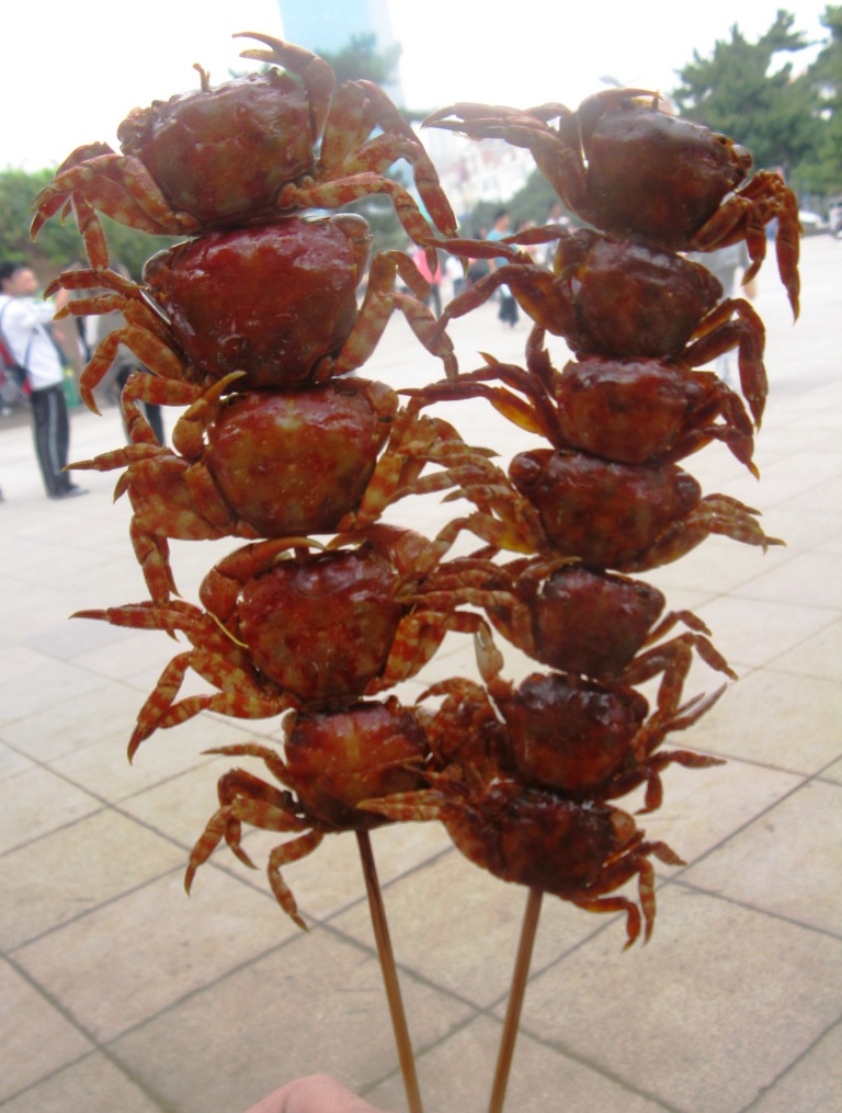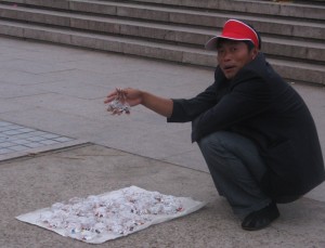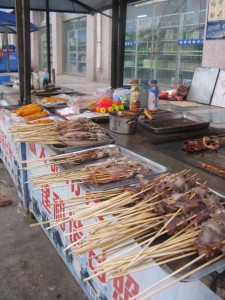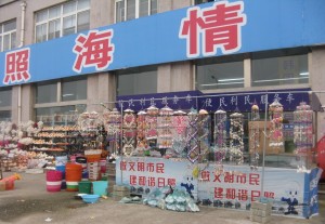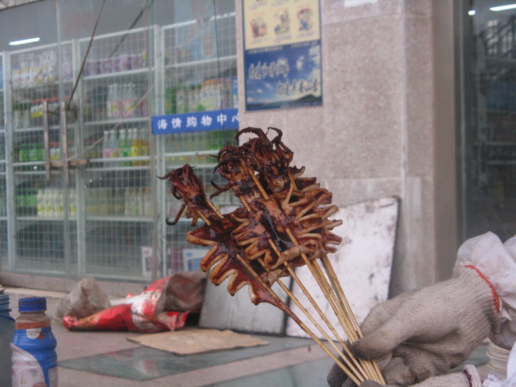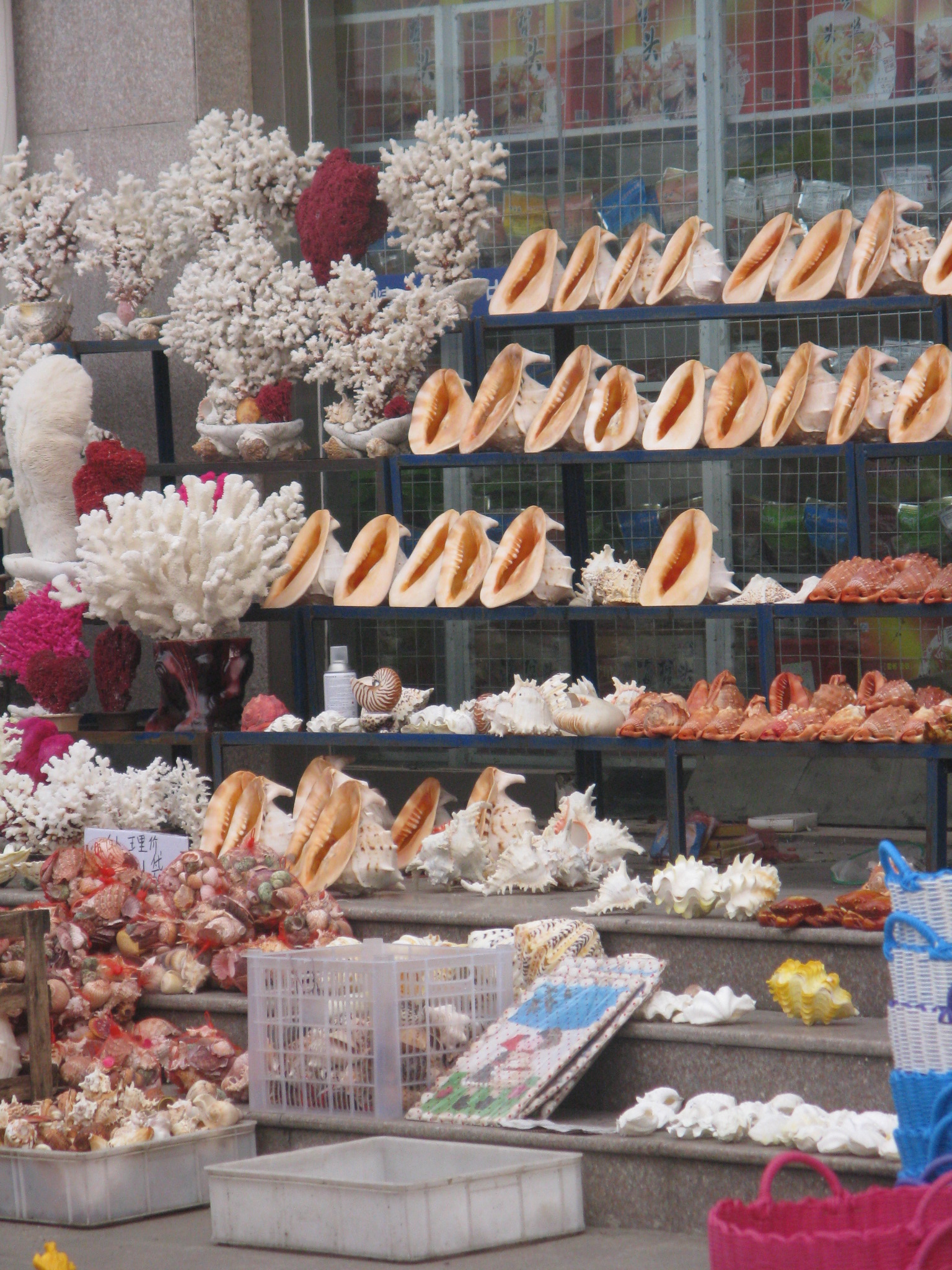 That was the end of a whirlwind trip to Qingdao. We piled into the bus for a couple of hours trip to Rizhao, south of Qingdao. We’d been told not to buy anything in Qingdao as prices were too expensive so of course stopped a the usual concrete monstrosity where there were dried fish and fish products a plenty not to mention some tea. I splurged on 2 bottles of water. Shell products in addition to some kebabs and dried starfish were sold outside the shop.