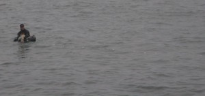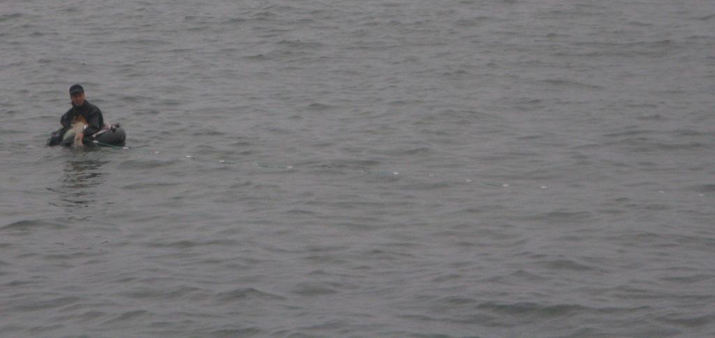 Fisherman pulling in his net close to the waterfront. Several raft type boats were pulled up on the sea wall.