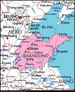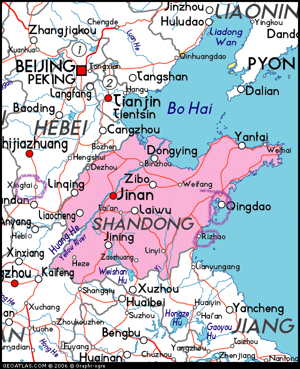 The pink area is the province of Shandong. The purple circles show the departure city and Qingdao and Rhizhao.