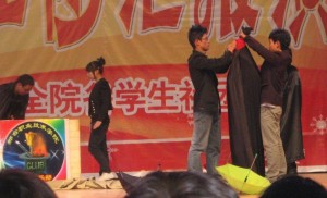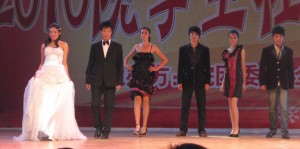 The flower arrangers and calligraphers had an imaginative way of presenting themselves as had the photographers. In cultural contrast were the inline skaters as they spun and danced around tiny witches hats. In addition we saw a pretty good magic show which included the disappearing /exchange of person trick although the”baddie” needs to get himself a more convincing cape. There was a catwalk display including wedding and after five gowns. These are college courses; modelling and garment making, so I’m not sure why they were there. About 16 students sang as they signed. The only other evidence I’ve seen of sign language was its appearance in a prerecorded aeroplane safety briefing where it was sandwiched between Chinese and English.