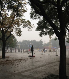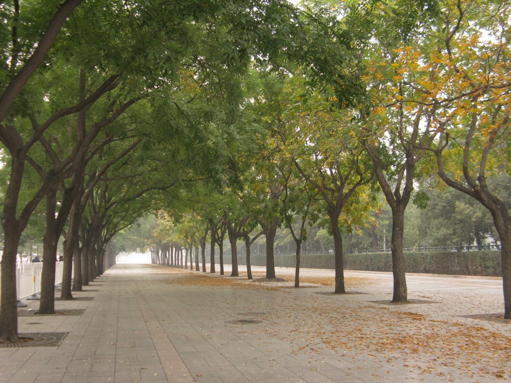 These trees go from near the Great Hall of the People to near the street corner where the man was standing. Autumn has started with falling leaves.
