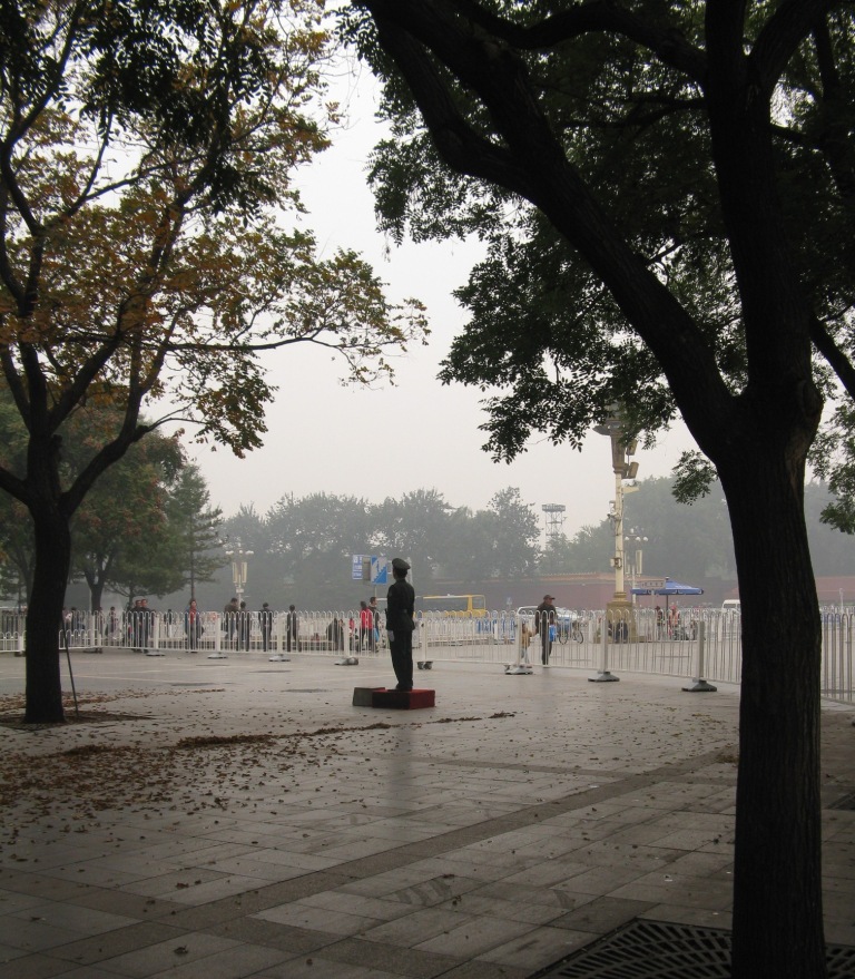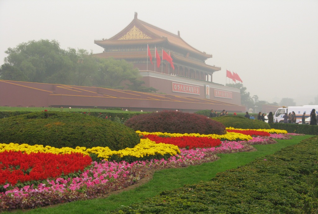 This shows how white the atmosphere was. This is Tiananmen Gate which is the one commonly seen on TV. It is the entrance to the Forbidden City. The city is still colourful with recently planted or placed flowers to celebrate National Day on October 1st.