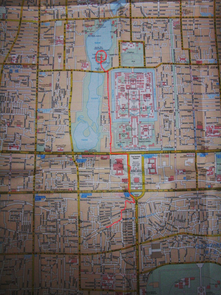 The map shows where I started in the south and walked north past Tiananmen Square, the Forbidden City and various neighbourhoods. The photos show some of the scenes along the way. I returned part of the way by bus.